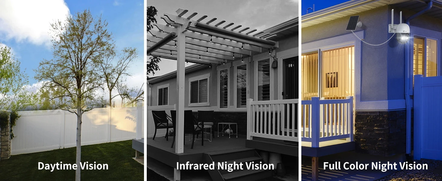 4MP HD solar security wireless outdoor camera supports black and white IR night vision and full color night vision, you can choose one of the light modes as you need.