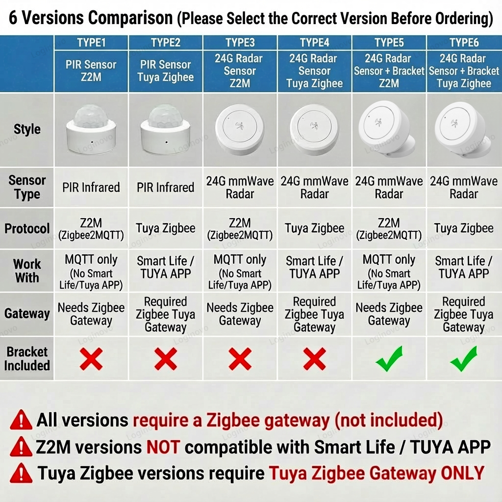 We offer 6 different models, all requiring a Zigbee hub. Please review the differences carefully to select the right version for your setup: